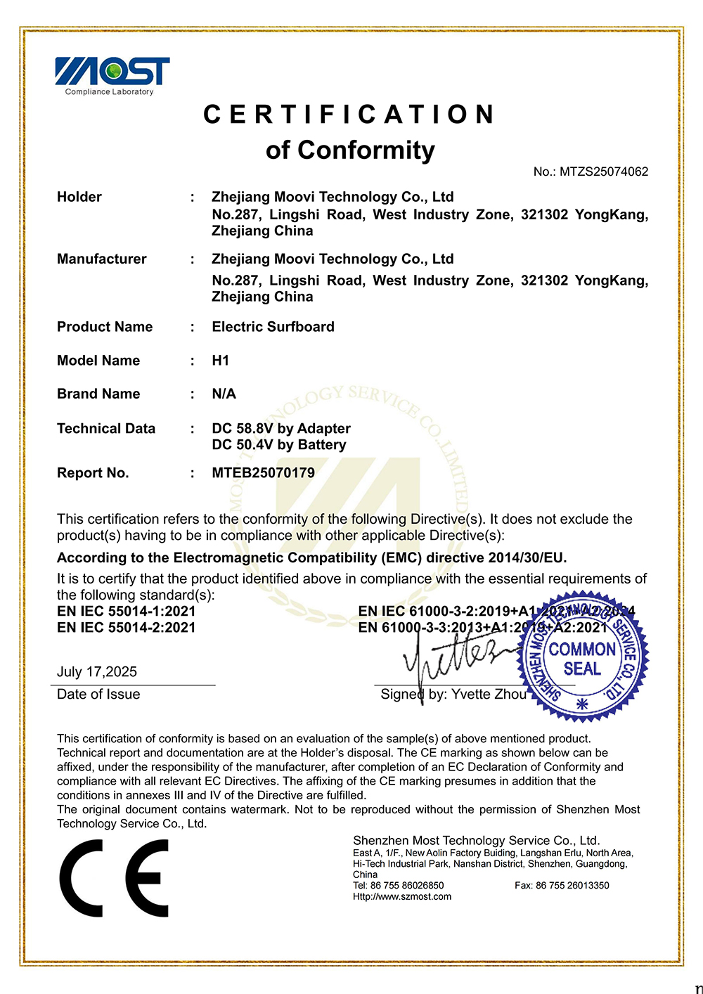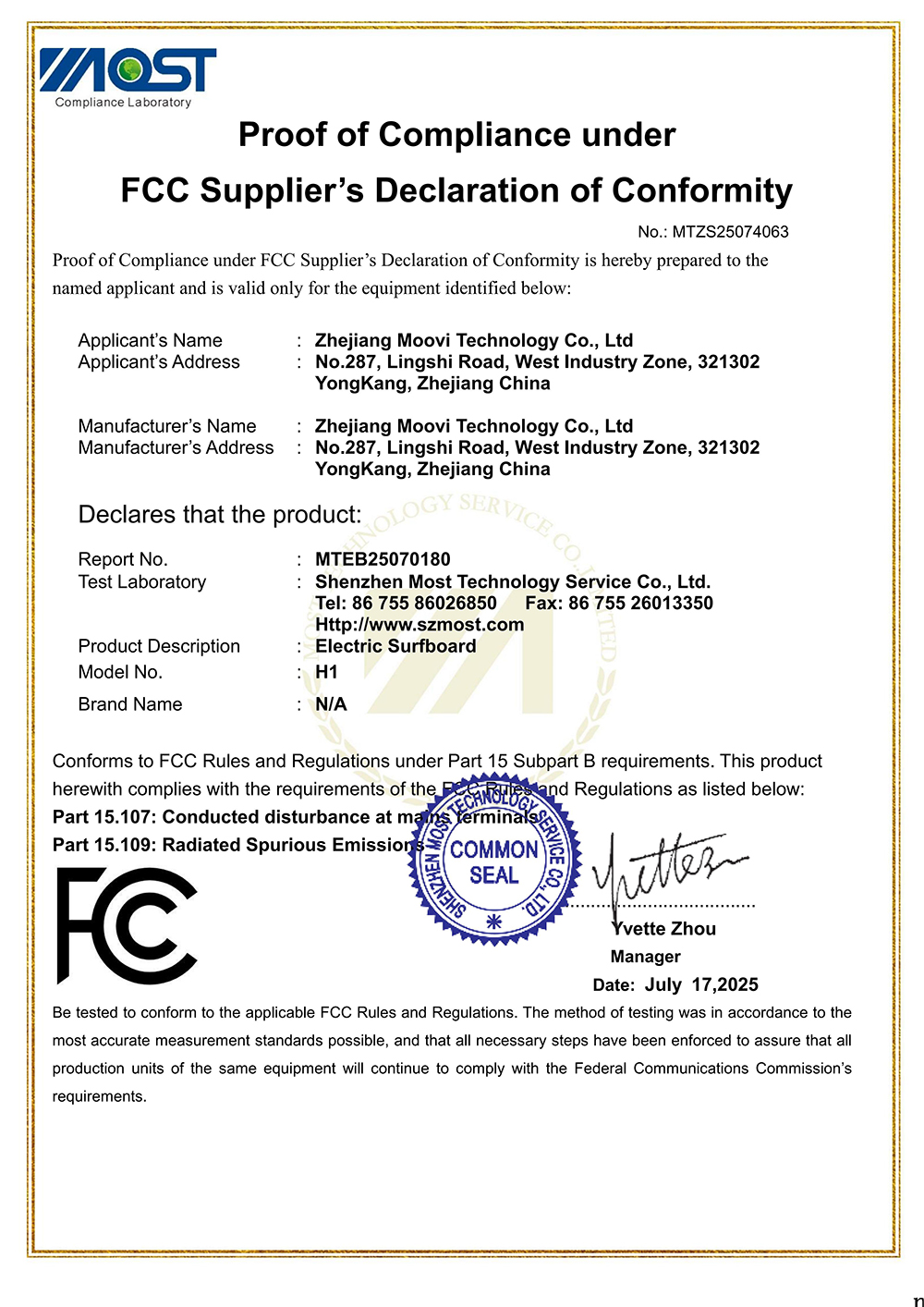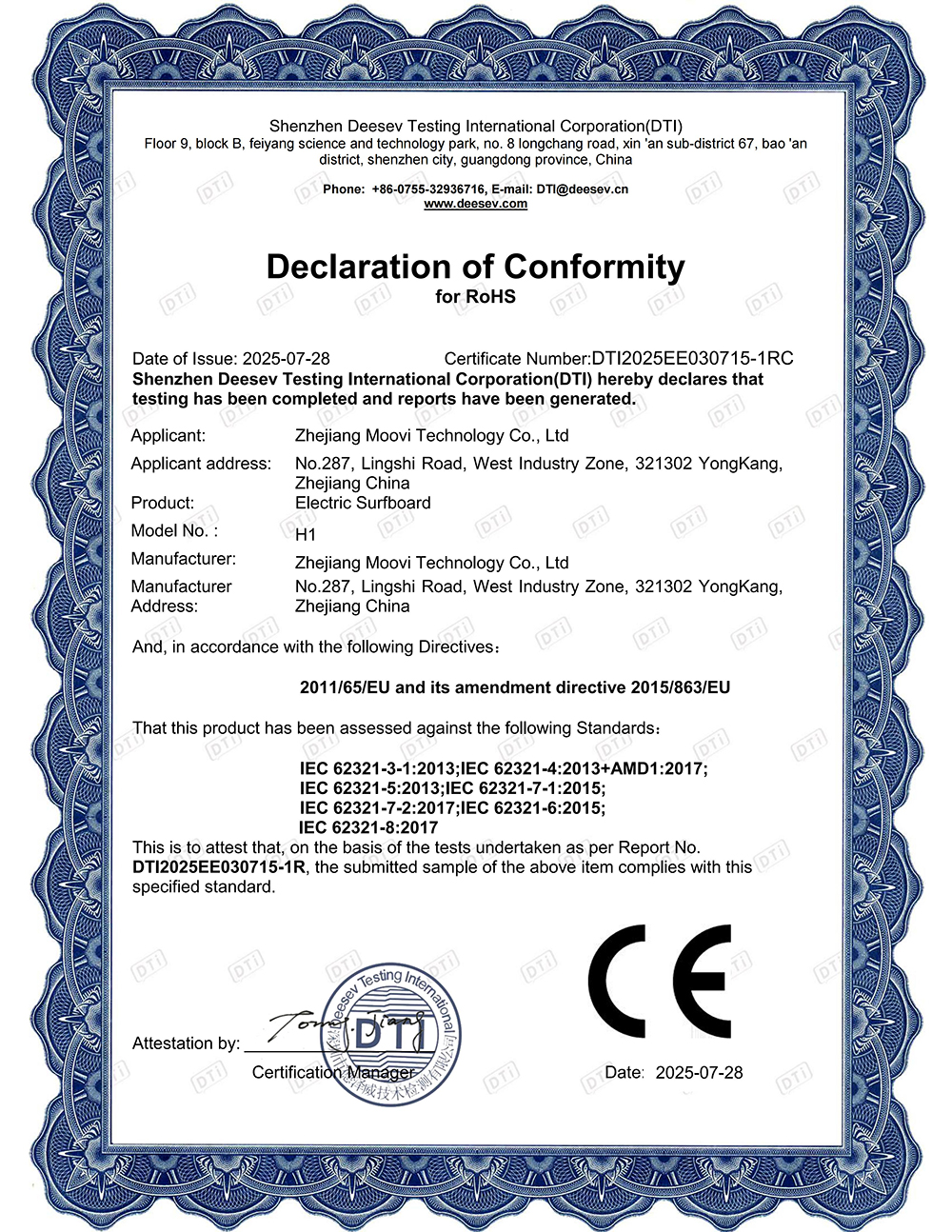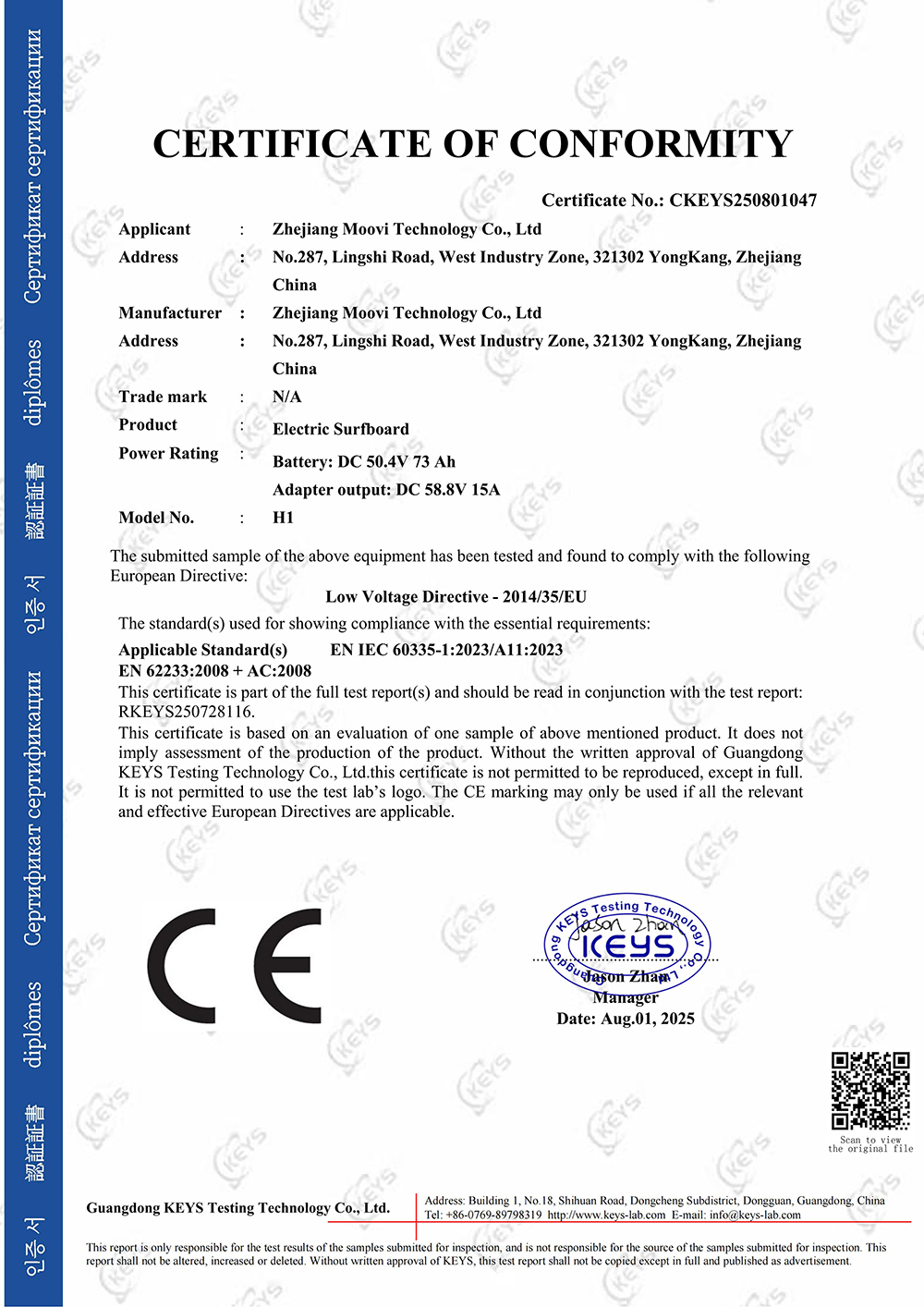 SINCAR Technology has announced that its newly upgraded H1 Electric Surfboard has successfully obtained several major international certifications, including CE, EMC, FCC, and RoHS. This achievement underscores the company's commitment to meeting rigorous global standards for safety, performance, and environmental sustainability.